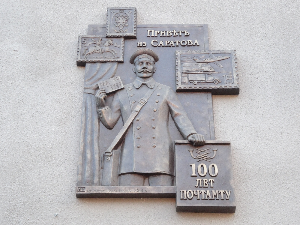 Интересным арт-объектом стала памятная доска, которая была торжественно открыта в октябре 2017 года по случаю 100-летия здания Саратовского почтамта на его фасаде. Его автор - заслуженный художник России Андрей Щербаков. Здание стоит на земельном участке площадью 880 кв. м., его стоимость 100 лет назад составляла больше 112 тыс. руб. Возвели почтамт за 2 года и 5 мес. на народные средства. По словам автора барельефа Андрея Щербакова, «в барельефе отражены этапы становления почты. И, конечно же, главным действующим лицом композиции является почтмейстер начала века».