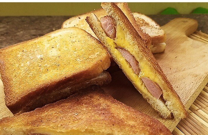 Ингредиенты для «Сэндвич с сыром и сосисками»: Время приготовления: 30 минут Количество порций: 4 Пищевая и энергетическая ценность: Готового блюдаккал
