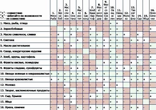 Для того чтобы избежать подобных явлений, следует учитывать совместимость продуктов в одном приеме пищи. Для этого разработано множество специальных теорий совместимости. В качестве примера предлагается таблица совместимости продуктов.