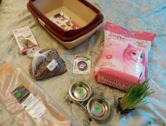 С таким первичным набором, я была готова уже взять кошку домой. Что мы и сделали. Видео первого дня у нас дома.