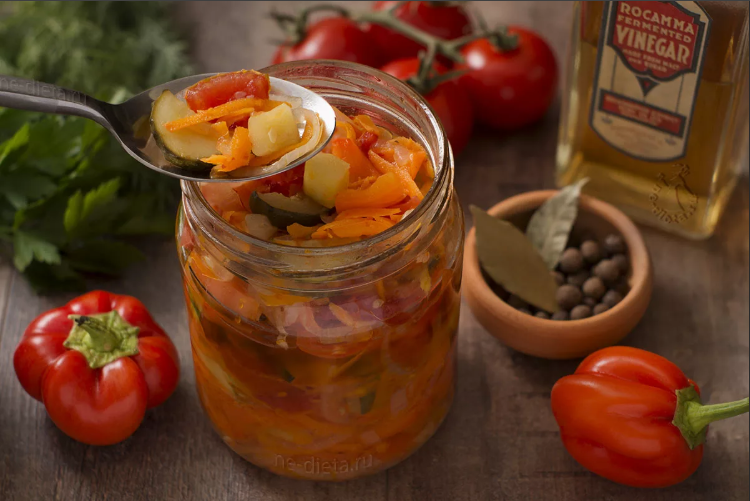 Овощной зимний салат Для приготовления такого салата нам понадобится: Для начала необходимо помидоры прогнать через мясорубку, а морковь растереть через терку. Баклажаны кабачки и перец нужно порезать на кубики. В получившееся пюре из томатов внести соль, сахар, чеснок, перец, петрушку и масло. Все это содержимое нужно переместить в мультиварку. Так же можно использовать и обычную газовую плиту. Такое пюре необходимо довести до кипения, затем высыпать туда все овощи и тушить еще около часа. В заключении получившуюся закуску надо разлить в стерилизованные баночки. Капустный салат Для приготовления такого салат вам понадобится: Для начала необходимо порезать капусту, перец и лук, а морковь прогнать через терку. Все получившееся элементы нужно аккуратно перемешать. Во все это содержимое необходимо внести уксус, подсолнечное масло, сахар и соль. Еще раз все тщательно перемешать. В заключении весь наш получившийся салат необходимо разложить по баночкам и дать настояться около трёх д