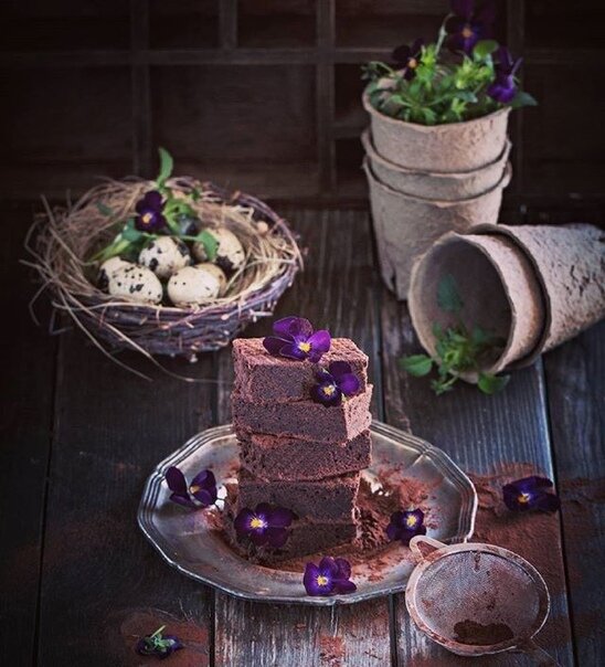 Шоколадный торт Сразу скажу , что это не брауни , планировала печь Crazy Devil Chocolate Cake, на кефире, но что-то пошло не так , и получился вот такой тортик, очень похож на брауни по текстуре и вкусу, но без характерной корочки в трещинку . Мука - 200 гр Сахар -80 гр Коричневый сахар - 100 гр Какао - 70 гр Соль - щепотка Кефир - 150 мл Горячая вода - 100 мл (не кипяток) Растопленное масло - 100 гр Яйца- 2шт Разрыхлитель - 1 ч л Нагреть духовку до 180 градусов. Две разъемные формы Ø18 см смазать маслом. Смешать вместе все сухие ингредиенты, кроме сахара . В другой миске яйца взбить с сахаром, добавить кефир, горячую воду ,масло . Соединить сухую смесь с яичной и перемешать до однородной массы . Разлить тесто по формам . Выпекать около 30 минут . Я уже писала выше , что задумывала печь торт . То есть готовые коржи следовало разрезать вдоль пополам и смазать шоколадным кремом . Но не знаю почему, мои коржи получились не высокие , хотя в оригинале брались две формы ди