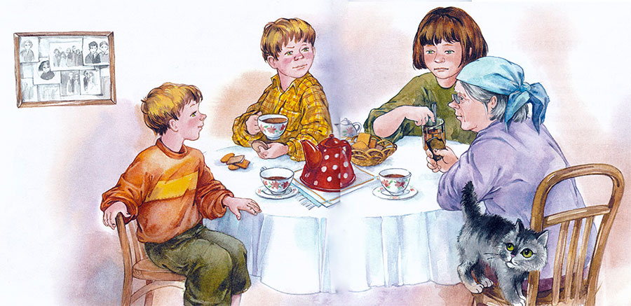 Мама высыпала на тарелку печенье. Бабушка весело зазвенела чашками. Все уселись за стол. Вова придвинул тарелку к себе. — Дели по одному, — строго сказал Миша. Мальчики высыпали все печенье на стол и разложили его на две кучки. — Ровно? — спросил Вова. Миша смерил глазами кучки: — Ровно… Бабушка, налей нам чаю! Бабушка подала обоим чай. За столом было тихо. Кучки печенья быстро уменьшались. — Рассыпчатые! Сладкие! — говорил Миша. — Угу! — отзывался с набитым ртом Вова. Мама и бабушка молчали. Когда все печенье было съедено, Вова глубоко вздохнул, похлопал себя по животу и вылез из-за стола. Миша доел последний кусочек и посмотрел на маму — она мешала ложечкой неначатый чай. Он посмотрел на бабушку — она жевала корочку черного хлеба…