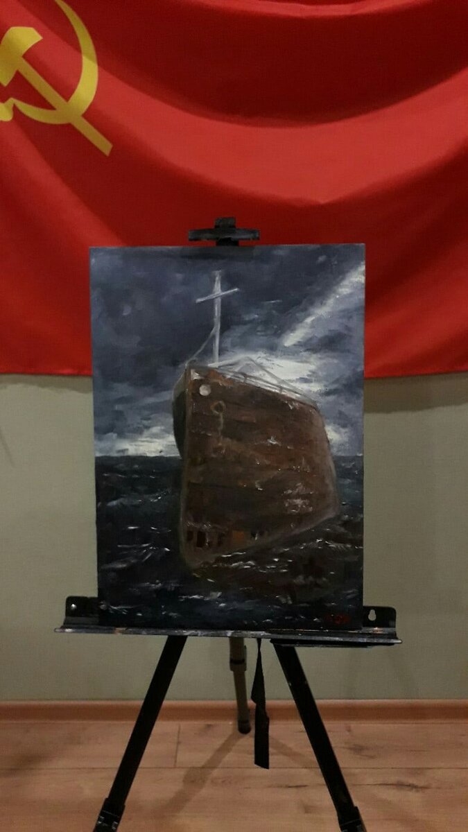 На самом деле у данной работы больше интересна история самого холста, нежели того, что изображено на нем, поэтому давайте с нее и начнем. Изначально я купила данный холст для написания портрета в честь подарка на День рождения одному человеку. Я уже начала прописывать маслом фон, но как-то забросила и в итоге так вышло, что подарок дарить этому человеку совсем не хотелось, поэтому я отложила холст до лучших времен. Буквально через недели 2-3 я очень вдохновилась песней Агаты Кристи "Два корабля" и решила написать картину к этой композиции. Слушая эту песню я представляла огромный ржавый корабль, что качался на волнах. И темное мрачное небо предвещало нам о том, что вот-вот начнется буря и неизвестно переживет ли ее этот крейсер. Думаю, вы должны сами послушать эту песню, погрузиться в ее атмосферу и задуматься над ее смыслом. Эта работа является самой большой моей картиной и писала я ее не 2-3 вечера, как пишу другие. Также ушло достаточно много не только времени, но и масла,