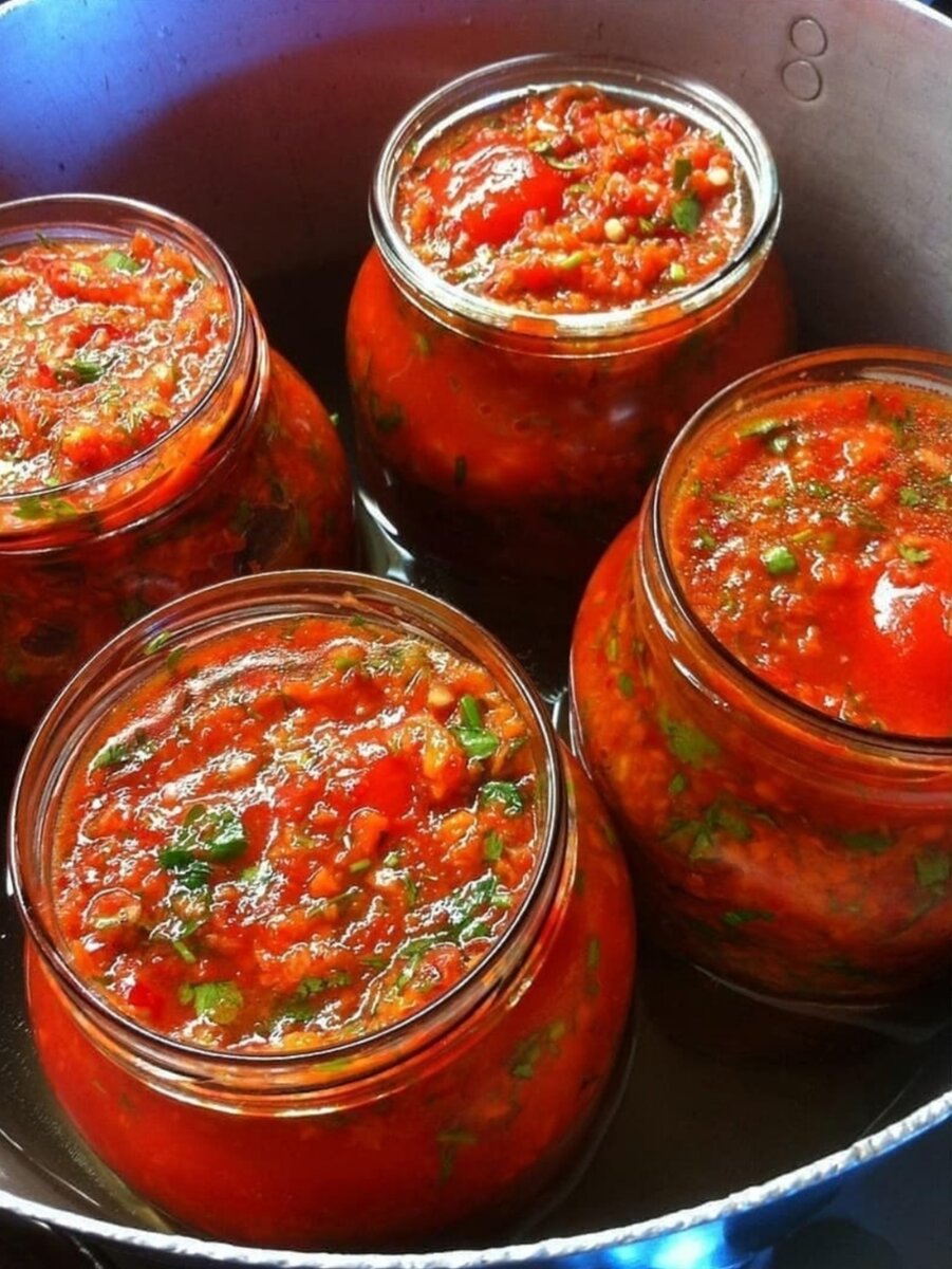 Вкус просто супер. Аромат на весь дом. Ингридиенты: Помидоры-2кг Морковь средняя-4шт Перец балгарский-5шт Масло ростительное-100гр Уксус9%-100гр Чеснок-100гр Горький перец-1шт Соль-2ст.л Сахар-100гр Петрушка и укроп Приготовление Помидоры если небольшие разрезать на 2 части ,если крупные то на дольки. Остальные ингридиенты пропустить через мясорубку . Помидоры укладывать слоями в банку засыпая прокрученными овощами чередуя слои. Затем банки ставим в кастрюлю и стерелизуем 20-25 мин. После заказываем, и укутываем. Приятного аппетита. 🤗