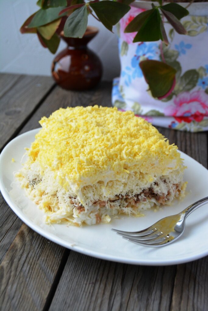 Салат "Мимоза" классический Всем знакомый салат, подходящий для праздничного стола по любому поводу. Салат Мимоза - классический рецепт салата лёгкий в приготовлении и невероятно нежный на вкус. Время приготовления: 2 часа 30 минут. Ингредиенты Рыбные консервы в масле — 200 Грамм (1 банка лучше сайры) Картофель — 300 Грамм (4 средних картофелины) Морковь — 200 Грамм (4 средних морковки) Лук — 100 Грамм (2 средних луковицы) Сыр — 150 Грамм (Твёрдого сорта) Майонез — 250 г Яйца — 4 Штуки Зелень — 50 Грамм (Укроп или петрушка) Пошаговая инструкция 1. Первым делом нужно отварить картофель, морковь и яйца. Отваренные продукты остудить и почистить. На мелкой тёрке натереть картошку, морковку, белки, желтки и сыр (всё в отдельных мисочках или тарелках). В салатницу выложить рыбу с маслом и размять вилкой по всей поверхности дна посуды. Сверху смазать небольшим количеством майонеза. 2. На рыбу сверху разложить натёртые белки, смазать майонезом. 3. Сверху на белки выложить натёртую морков
