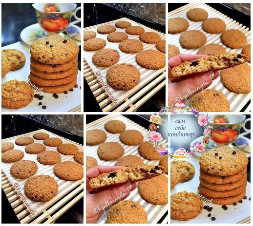 ИНГРЕДИЕНТЫ: ● 200 г овсяных хлопьев быстрого приготовления ● 280 г муки ● 10 г разрыхлителя ● 1/3 ч ложки соли ● 1/3 ч ложки соды ● 200 г сливочного масла ● 200 - 250 г мелкого сахара или сахарной пудры ● 2 ч ложки ванильного сахара ● 2 крупных яйца ● Шоколадные капли, изюм, семечки и т.п. по желанию ПРИГОТОВЛЕНИЕ: Смешиваем: муку, разрыхлитель, соду, соль - просеиваем. Перемешиваем с овсяными хлопьями. Мягкое сливочное масло растираем с сахаром, ванильным сахаром. Взбиваем (миксером) масляно-сахарную смесь в пышную белую массу. Не прекращая взбивания добавляем (по одному) яйца. Взбиваем пару минут. Затем, во взбитое сливочное масло постепенно вмешиваем заранее подготовленную мучную смесь. Быстро замешиваем тесто (сначала ложкой, а затем руками). Долго месить/вымешивать тесто не нужно, главное - добиться однородности. В конце замеса я добавила в тесто шоколадные капли.Тесто должно получиться довольно мягким, липковатым; такой консистенции, что из него можно слепить