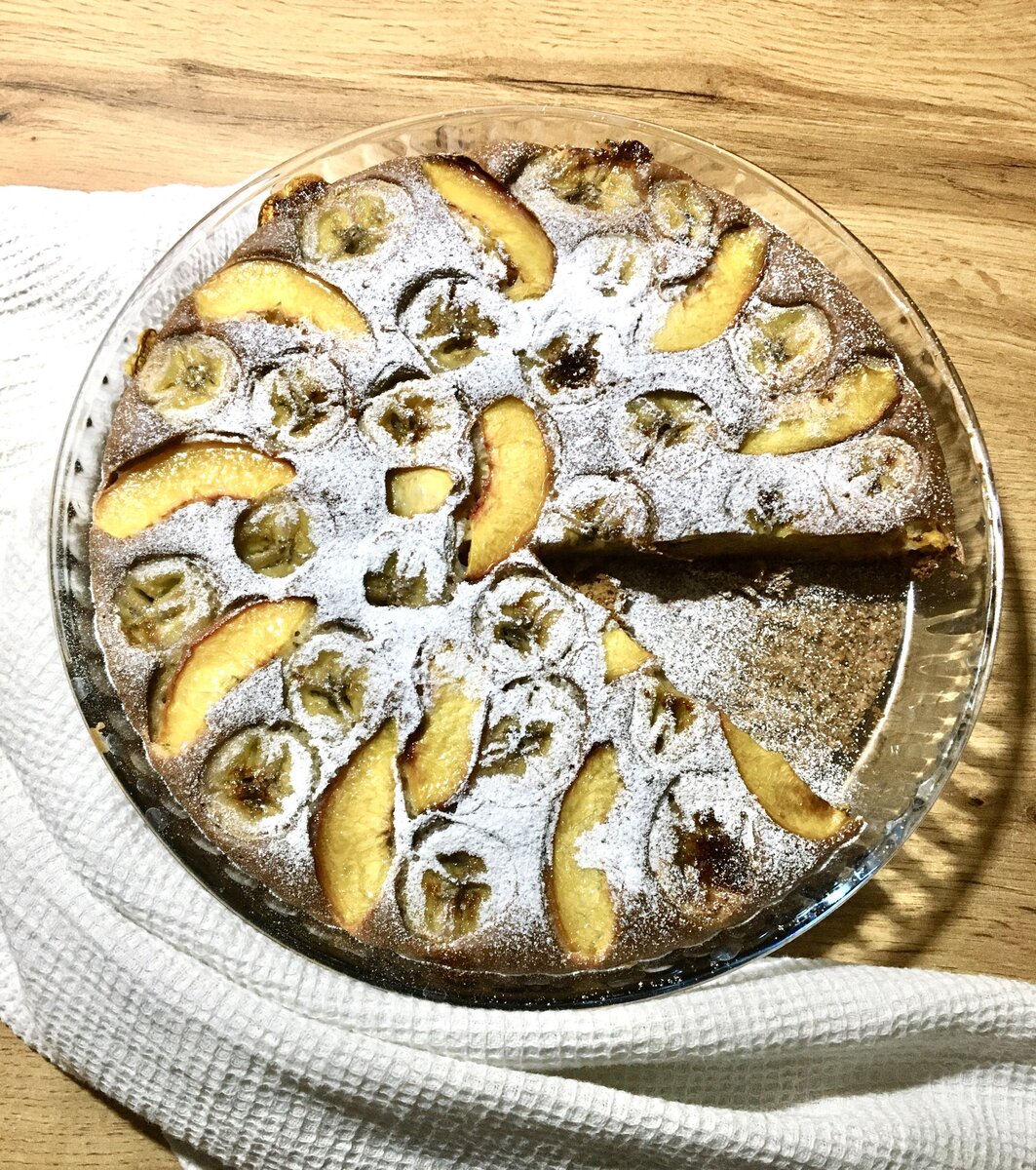 Очень простой и вкусный пирог. Ингредиенты: •1,5 стакана пшеничной муки; • 1 стакан кефира; • 2 яйца; • сахар 3-4 ст.л. (либо подсластитель 7гр) • 1 ч.л. соды; • ванилин; • банан, нектарин. Все ингредиенты, кроме фруктов, смешать блендером 5мин, вылить в форму для выпечки, сверху выложить дольки фруктов. Запекать в духовке 30 мин при 160градусах до румяной корочки. После остывания сверху посыпать сахарной пудрой. Приятного аппетита. За лайк + 100500 к карме)))