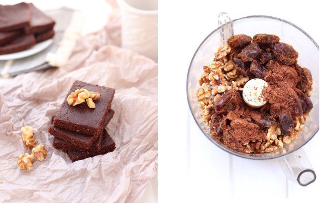 Ингредиенты: 2 чашки грецких орехов 1 чашка фиников без косточек 3 столовые ложки сырого какао-порошка 1/2 ч.л. морской соли Приготовление: Добавьте все ингредиенты в кухонный комбайн или блендер и измельчите до тех пор, пока смесь не соберется в липкий шар. Раскатайте полученную смесь, Распределите смесь на пергамент в сковороде или другой ёмкости, но так, чтобы верх был плоским. Отправьте в морозилку не менее чем на 1 час. Затем выньте из морозильника и разрежьте на 12 квадратиков. Хранить в герметичном контейнере в морозильной камере.