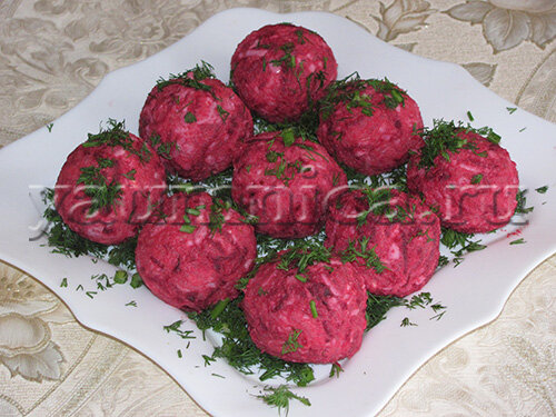 4. Далее формируем шарик так, чтобы филе селедки оказалось внутри него. Формируем такие шарики из всей массы и выкладываем их на блюдо рядом друг с другом.