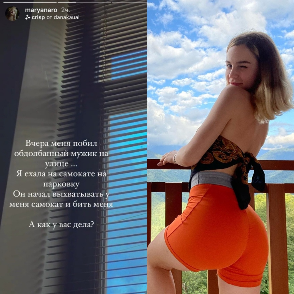 вчера избили девушку репера Face-а и блогера Марьяну ро совершил это неизвестый. Так коментирует пострадавшая "вчера меня побил обдолбанный мужик на улице... я ехала на самокате на парковку он начал выхватовать у меня самокат и бить меня"