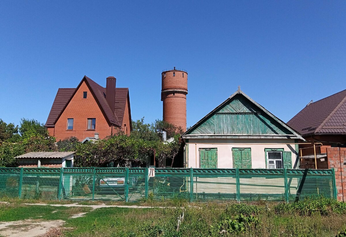 Видели водонапорную башню? Скорее всего, это была металлическая башня Рожновского, каких по всей России тысячи понаставлено. Стоимость 18-ти метрового «грибка» примерно 500 т.р. (небольшой бак) и более 700 за объёмное бачище. Всего 15-20 дней, и вот она уже готова к эксплуатации. Другое дело, возвести красивую башню, которая будет величественно возвышаться над городом, радовать глаз и вообще, вокруг неё не придётся отгораживать участок на случай аварийного заваливания. В городе Приморско-Ахтарске случайно обнаружена такая. Вероятно, построена ещё до 1930 года. И это ещё не самое старое сооружение города. Что мешает администрации её отреставрировать? Если крена нет, можно превратить её в смотровую. Вроде как в городе не смотровых, а так была бы… Это просто двукратный зум, я не взлетал. Судя по дверце, используют как сарайчик. Ну а вот это младший «водонапорка» по пути из города.