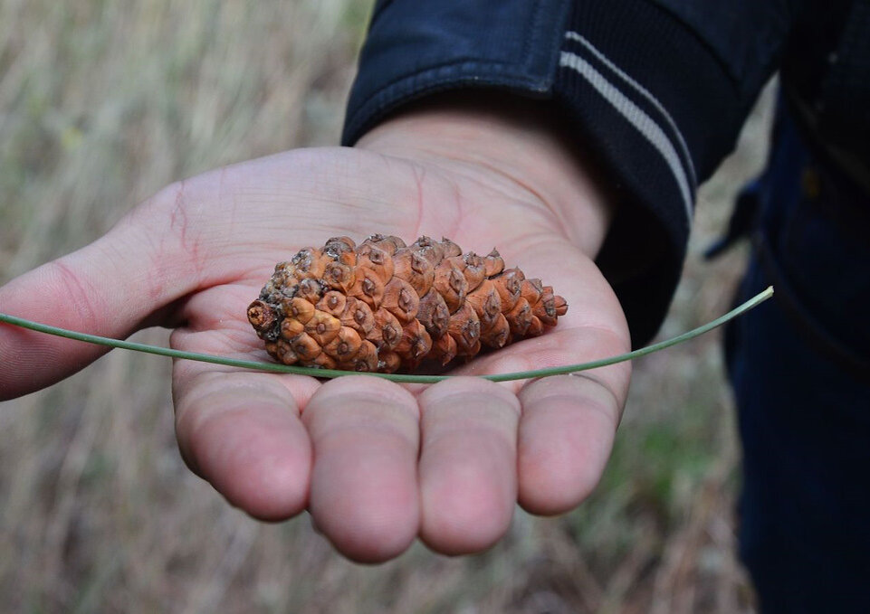 После бескрайних степей любой холм — уже гора. Поэтому Ставрополье поражает воображение любителей пейзажей, возвращающихся из Калмыкии. Кое-где это просто холмы, а кое-где даже лесистые склоны. В одно такое место мы и направились. Мимо села Бешпагир, в необычную рощу. В 30е годы для укрепления песков на холме высажены саженцы крымской сосны. Её отличие от обычной сразу бросается в глаза — длина иголок около 15 см, с ладонь взрослого человека, шишки же небольшие, по форме напоминающие кедровые.