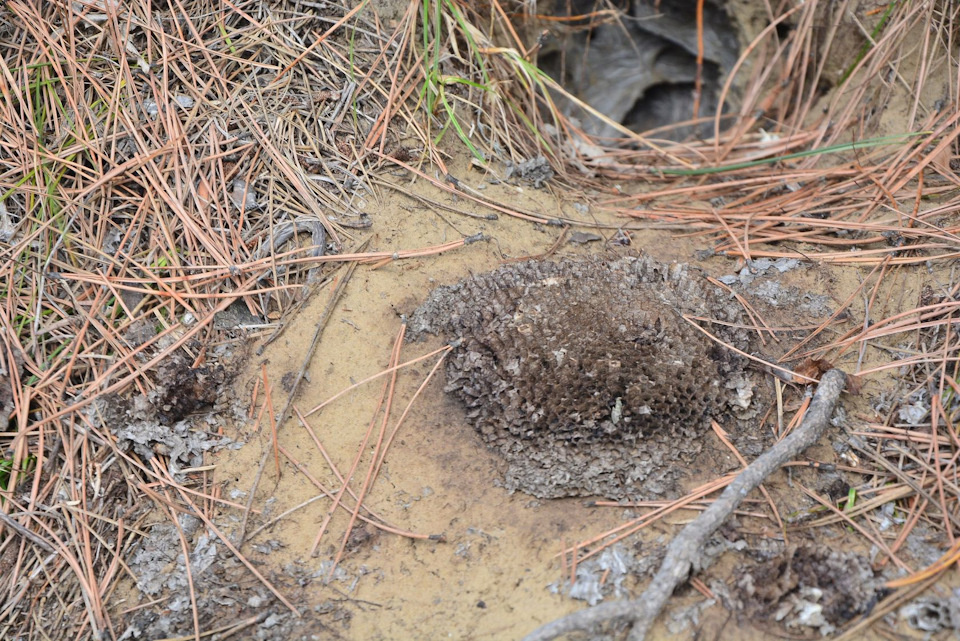 Дорога идет в песчаную гору и заворачивает в лес. На удивление, здесь чисто и нет следов присутствия свиночеловека. Лес полюбился барсукам или еще каким-то зверям, разоряющим гнезда земляных ос.