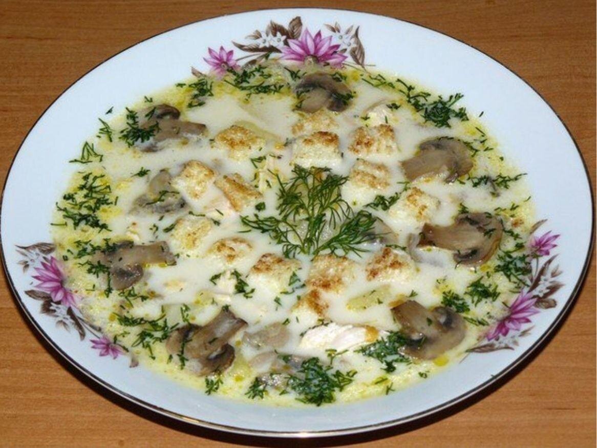 Ингредиенты Сыр плавленный 2шт Курица (филе) 1шт Шампиньоны 400г Картофель 4шт Морковь 1шт Лук 1шт Укроп Перец душистый горошек Соль Батон Из филе и 2 литров воды сварить бульон. Мясо вынуть, нарезать кусочками. Небольшие грибы нарезать пластинками, крупные - кусочками. мелко нарезать лук. Морковь и плавленные сырки натереть на крупной терке. Пассивировать на растительном масле лук и морковь. Пожарить грибы. Картофель нарезать кубиками, добавить бульон, посолить после закипания, варить до готовности. Затем добавить пассеровку, грибы, тертые сырки, душистый перец. Варить еще 10 минут - пока не растворится сыр. Периодически помешивать. В конце добавить мелко нарубленный укроп. суп в тарелках посыпать сухариками. Для того чтобы сделать сухарики, нужно нарезать небольшими кусочками или соломкой ломтики батона или хлеба, подсушить их на сковороде, помешивая. Сковорода может быть сухой или немного смазанной растительным маслом. Приятного аппетита.