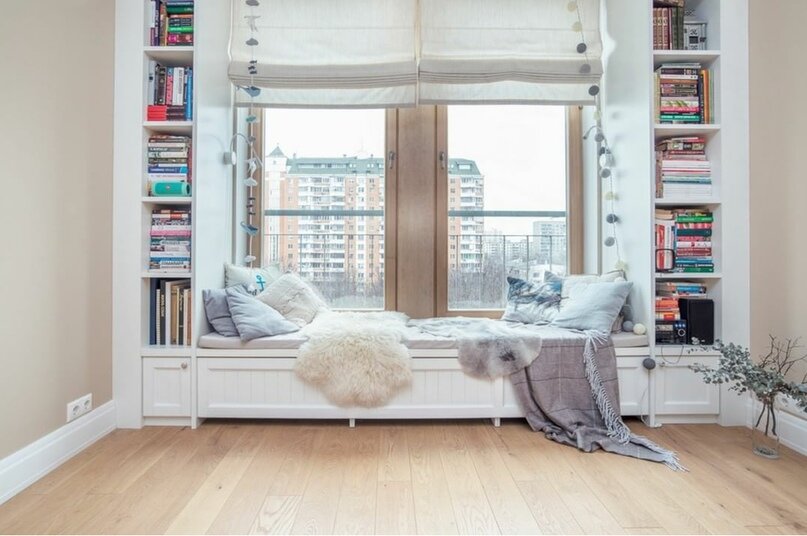 Подоконник в зоне отдыха: если окна расположены на небольшой высоте, подоконник вполне может стать дополнительным местом для сидения. В этом случае ширина подоконника должна быть не менее 60-ти см, а возвышаться над полом он будет примерно на 50 см.