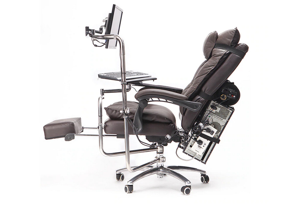 Называется это чудо китайской мысли "OK910 кресло с наклоном для полного движения, держатель для клавиатуры с монитором, зажим для стула, поддержка запястья на локтях, коврик для мыши для игрового офиса", стоит $252 и ещё доставка почти столько же.