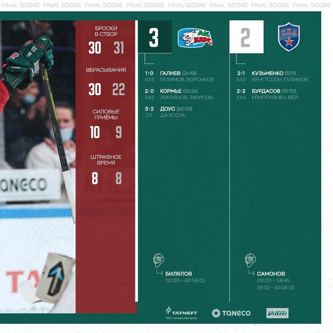 6 сентября «Ак Барс» победил СКА в домашнем матче регулярного чемпионата КХЛ со счётом 3:2 в овертайме. В первом периоде команды не смогли отличиться. Форвард СКА Кирилл Марченко убежал один на один с Тимуром Биляловым, но вратарь казанцев поймал шайбу в ловушку. Хозяева открыли счёт в начале второго периода. Артём Галимов вошёл в чужую зону после передачи Дмитрия Воронкова и сделал пас на Станислава Галиева, который в касание отправил шайбу в сетку. Появление по ходу второго периода 19-летнего нападающего Ильи Сафонова оживило атаку казанцев. В одной из атак Сафонов вывел на бросок капитана «Ак Барса» Даниса Зарипова, но вратарь гостей Александр Самонов отразил шайбу. Именно Сафонов и начал вторую голевую атаку казанцев. Он сделал передачу на Зарипова, который пересёк красную линию и вбросил шайбу в чужую зону. Первым к ней успел Артём Лукоянов и сделал передачу на Патриса Кормье, который с ходу бросил в верхний угол. У гостей ушло 45 секунд, чтобы отыграть одну шайбу. Быструю ата