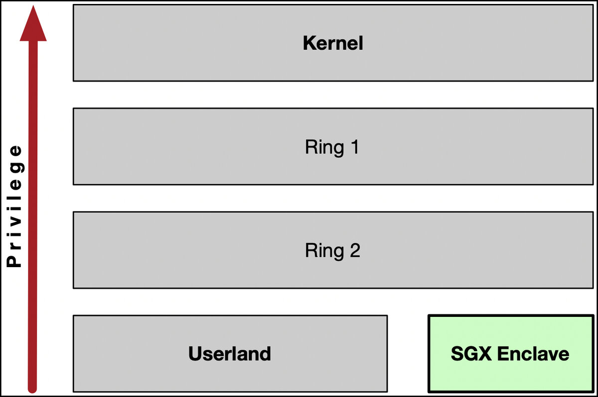 Основной задачей злоумышленника является получение уровня привилегий, который обеспечил бы ему доступ к необходимым ресурсам системы. Если это секрет приложения-жертвы, то злонамеренному приложению необходим именно тот уровень доступа, который отвечает за хранение секретов в системе. Отсюда напрашивается вывод, что управление секретами приложений стоит доверить самому внутреннему кольцу, ведь доступ туда получить сложнее всего. Однако, данный подход был несколько переосмыслен. Теперь все секреты хранятся на одном уровне с пользовательскими приложениями, как и код, который этими секретами управляет за одним условием: никто, абсолютно никто, кроме процессора, не может получить туда доступ. Программа и данные как бы упакованы в хранилище, в данном случае это хранилище называется анклавом (Enclave – закрытый, запертый), ключ от которого есть только у процессора.