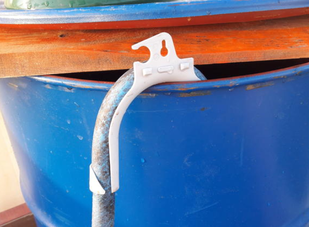 Если не хочется заморачиваться и сооружать конструкции для удержания шланга на бочке, то можно приобрести уже готовые держатели. Однако они стоят не дешево (от 300-400 рублей). Но они точно будут прочно удерживать шланг на месте, облегчат процесс набора воды в емкость.