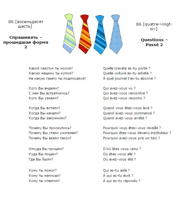 Французский язык. Урок 1. Французский язык. Урок 85. Добрый день! Продолжим изучение французского языка. Французский язык. Урок 86. 86 (восемьдесят шесть) - 86 (quatre-vingt-six) Спрашивать – прошедшая форма 2 - Questions – Passé 2 Какой галстук ты носил? - Quelle cravate as-tu porté? Какую машину ты купил? - Quelle voiture as-tu acheté? На какую газету ты подписался? - À quel journal t’es-tu abonné? Кого Вы видели? - Qui avez-vous vu? С кем Вы встретились? - Qui avez-vous rencontré? Кого Вы узнали? - Qui avez-vous reconnu? Когда Вы встали? - Quand vous êtes-vous levé? Когда Вы начали? - Quand avez-vous commencé? Когда Вы закончили? - Quand avez-vous arrêté? Почему Вы проснулись? - Pourquoi vous êtes-vous réveillé? Почему Вы стали учителем? - Pourquoi êtes-vous devenu instituteur? Почему Вы взяли такси? - Pourquoi avez-vous pris un taxi? Откуда Вы пришли? - D’où êtes vous venu? Куда Вы пошли? - Où êtes-vous allé? Где Вы были? - Où avez-vous été? Кому ты помог? - Qui as-tu aidé? Кому ты