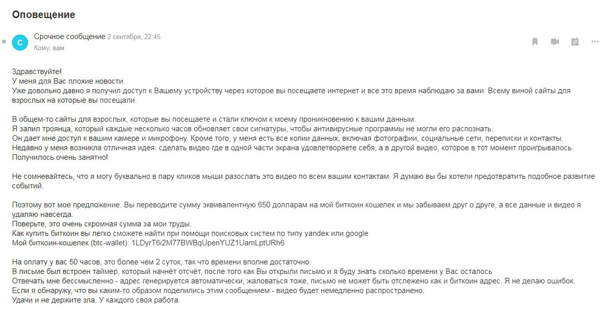 А биткойн-кошелёк. Пятиклассник (а может и пятилетник из ИТК), рассылающий эти письма, видимо не знает, что в сети биткойна все ходы записываются.