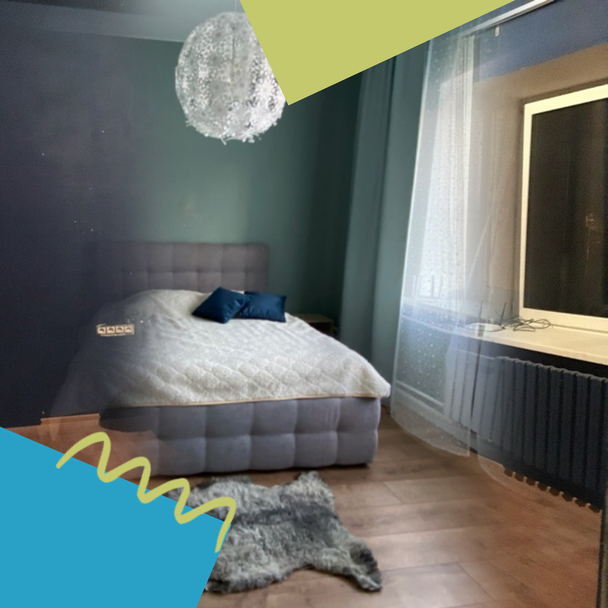 В комнате, площадью 15,7 кв.м стены, потолок и батарея были тёмно-синего цвета. Мы решили оформить комнату в голубо-серых тонах, но сделать её светлее.