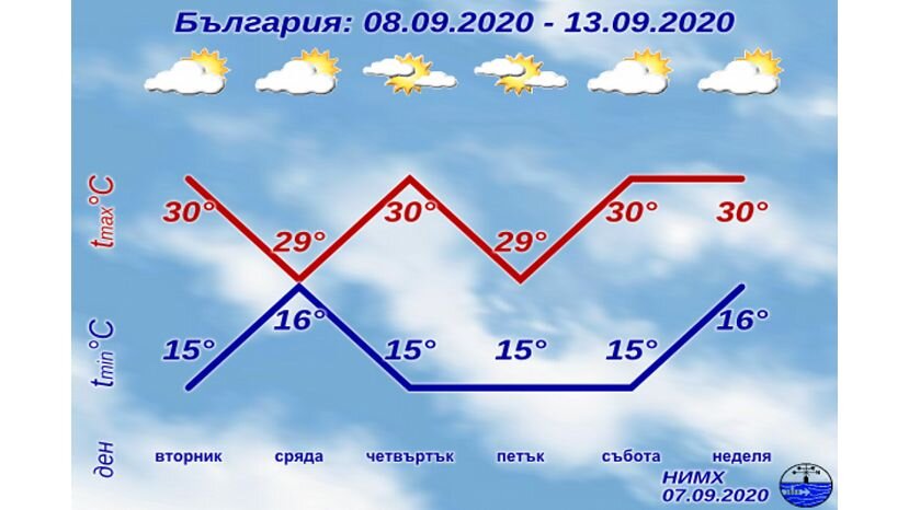 Сегодня будет солнечно, после обеда в горах с временными увеличениями облачности. Будет дуть слабый до умеренного восточный ветер. Максимальная температура будет между 28° и 33°... На этой неделе максимальная температура в Болгарии будет между 28° и 33°