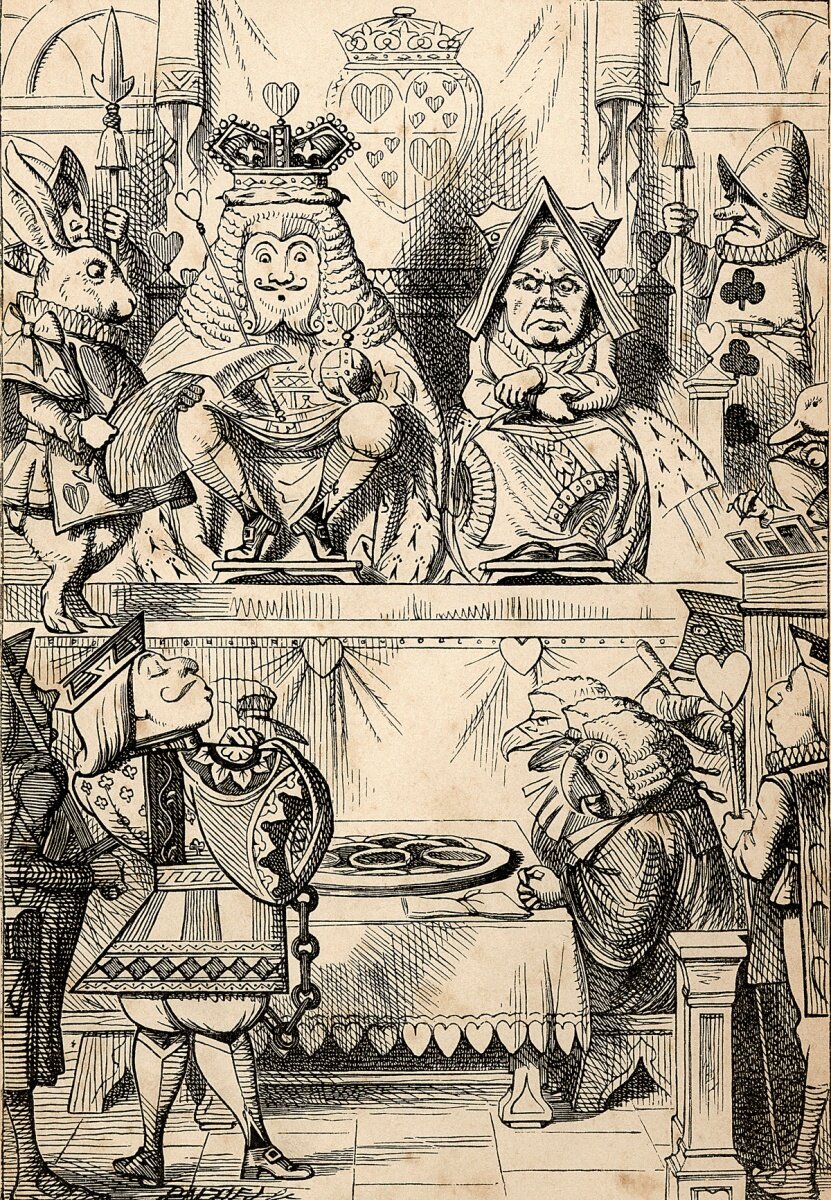 Так вот, страсти разгораются, копья ломаются, обвинения выдвигаются, заявления делаются. А я, мимоходом, решил перечитать «Алису в стране чудес». О! Сколько я всего не замечал в предыдущие прочтения! Об этом можно писать статьи, и они еще будут написаны, сейчас вот о чем. Там, почти в самом конце есть глава «Кто украл крендели?», речь в которой идет о судебном разбирательстве…