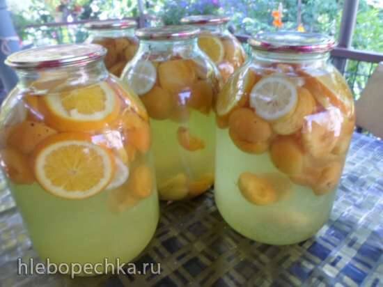абрикоса 0,5 л баночка (чищеные) апельсин 3-5 кружочков лимон 2-3 кружочка сахар 1 стакан Способ приготовления Приготовить 3-х литровые банки и крышки для закатки. Помыть и простерилизовать удобным для вас способом. Абрикосы помыть, разрезать на половинки и освободить от косточки. Апельсины и лимоны хорошо, щеткой, помыть под проточной водой. Положить в миску и залить кипятком. Через 1-2 мин горячую воду слить, а апельсины и лимоны хорошо каждый протереть салфеткой или полотеничком. Это делается для снятия воскового налета. Апельсины и лимоны нарезать на слайсы. Я резала на безножевой вставке терки Бернер (Прима) на самой большой толщине. Можно и чуть потолще нарезать. В каждую банку высыпать почищенные абрикосы и порезанные на слайсы апельсины и лимоны. Добавить в каждую банку по 1 ст сахара. Залить крутым кипятком и закатать. Каждую банку хорошо потрусить или покатать для полного растворения сахара. Хорошо укутать до полного остывания. Мои банки стояли по 2 дня под м