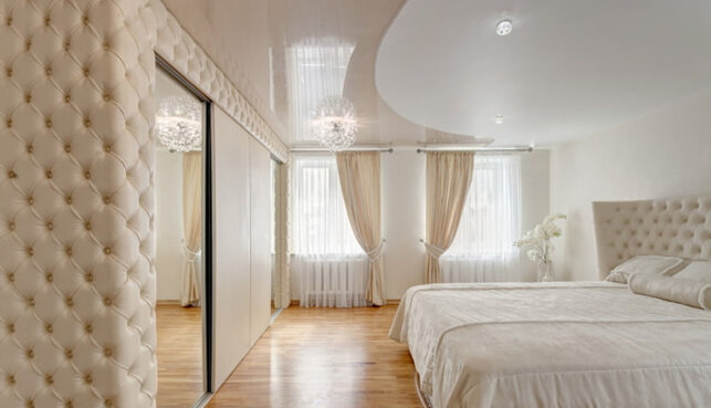 Если спальня большая и просторная, включает в себя 2-3 функциональные зоны, лучшим решением станут потолки в несколько уровней. Такая конструкция позволяет менять не только высоту установки, но и материал полотна. Например, в зоне с кроватью потолок может быть тёмным и матовым, а в рабочей или гардеробной части – глянцевым и светлым, чтобы добиться лучшего освещения.