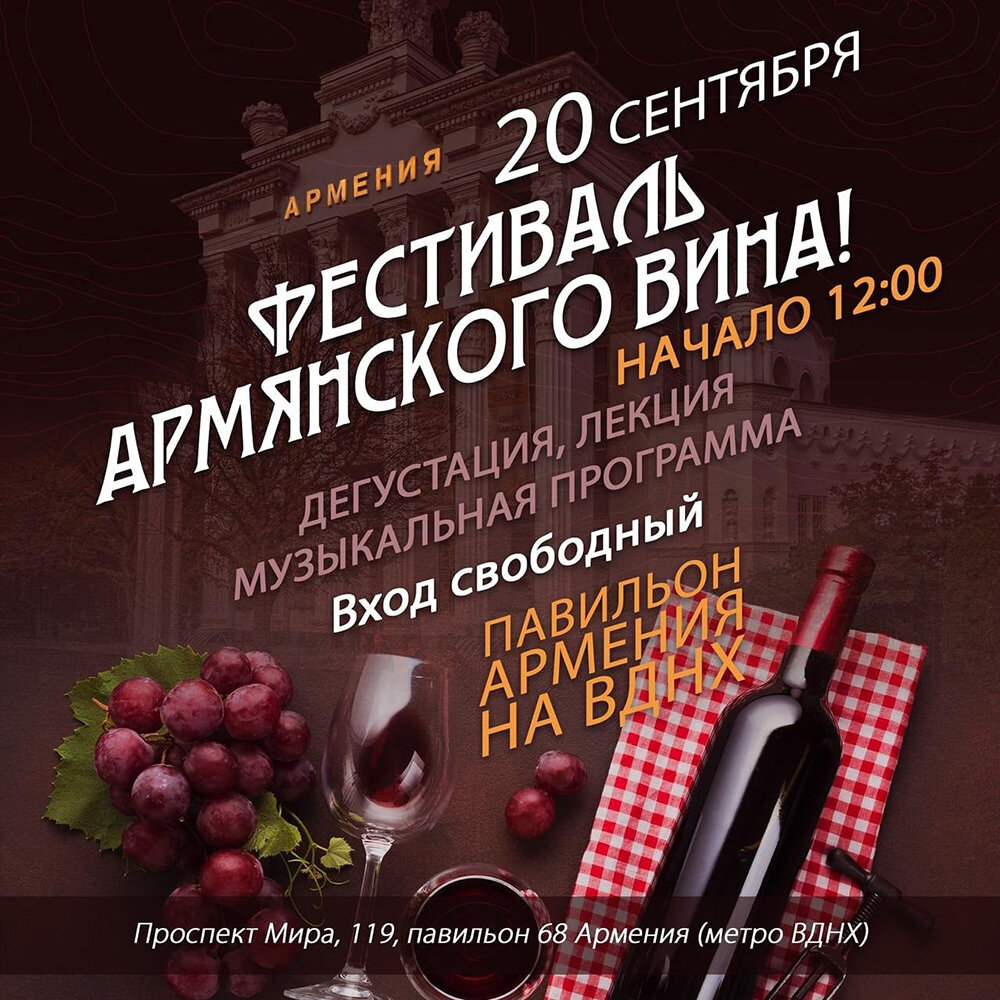 20 сентября в павильоне № 68 «Армения» на ВДНХ состоится Фестиваль армянского вина. Начало — в 12:00. Цель предстоящего фестиваля — поддержка армянских производителей вина и популяризация армянских винных брендов в России.