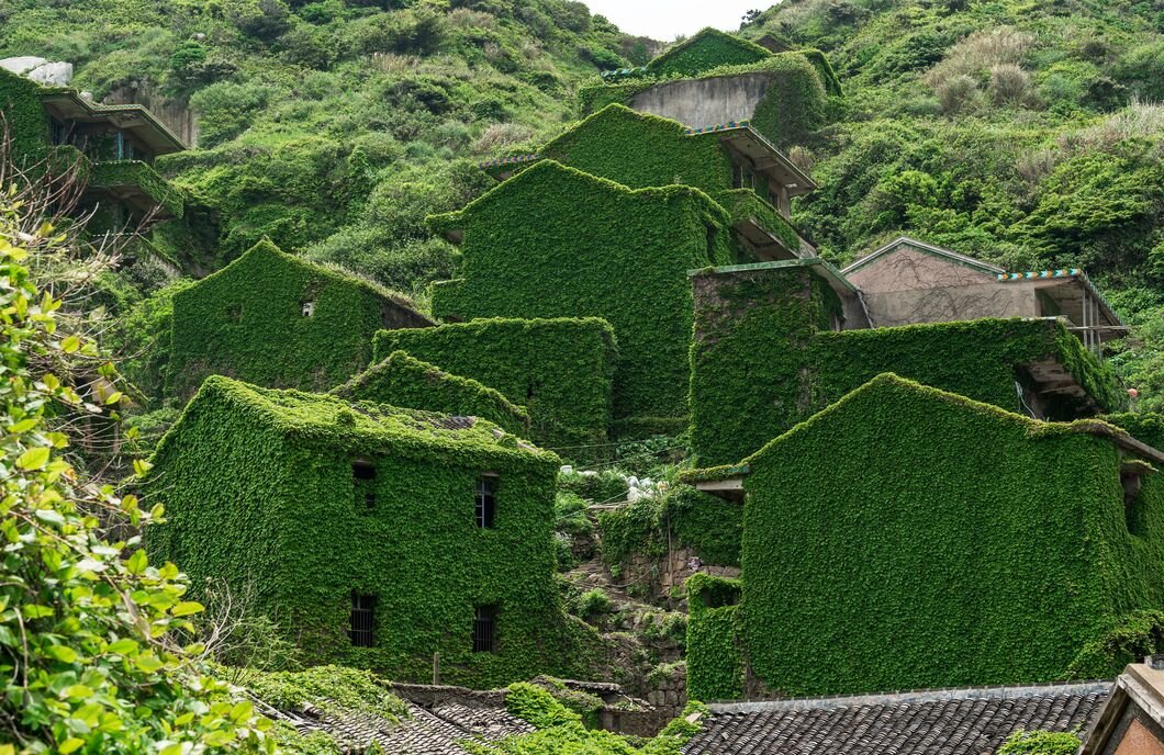 Небольшая рыбацкая деревня, которая расположена на одном из китайских островов архипелага Шенгси, была оставлена местными жителями в 1990-х годах. Из-за плохой транспортной связи и истощения рыбных ресурсов жители были вынуждены найти работу в других городах. Деревня когда-то была домом для более чем 2000 рыбаков, сейчас тут проживает меньше десятка человек. Теперь это поселение медленно и верно зарастает диким виноградом и переходит во власть природы. Растения медленно поглощают ветхие каменные здания, демонстрируя силу природы и создавая поистине фантастическое зрелище. Тихий живописный район на восточном побережье Китая не стал комфортным местом для жизни человека, но он быстро превратился в уютное жилище для местной флоры и фауны. Пустующие дома и разбитые окна уже полностью сливаются с процветающей зеленью. Так покинутый населенный пункт постепенно превращается из руин в зеленые джунгли, ставшие уже знаменитой местной достопримечательностью. Что делать в Шенгси? В первую очередь г