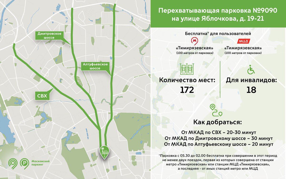 О некоторых из них знает не так много людей, поэтому там всегда есть свободные места. Сохраняйте, чтобы не забыть! Одна из таких парковок находится по адресу улица Яблочкова д. 19-21. С неё очень удобно пересесть на «Тимирязевскую» метро или первого диаметра. Паркинг рассчитан на 172 обычных и 18 инвалидных мест. Смотрите на инфографике, как совершенно бесплатно пользоваться ею весь день!