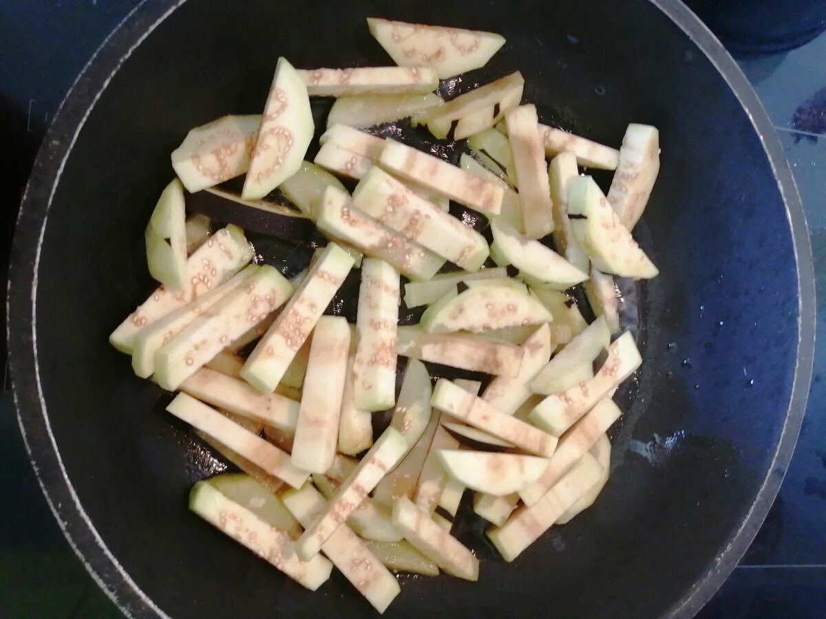 Баклажаны нарезаем соломкой, замачиваем в солёной воде на 20 минут, чтобы вышла горечь; отжимаем, жарим в сковороде на разогретом растительном масле.