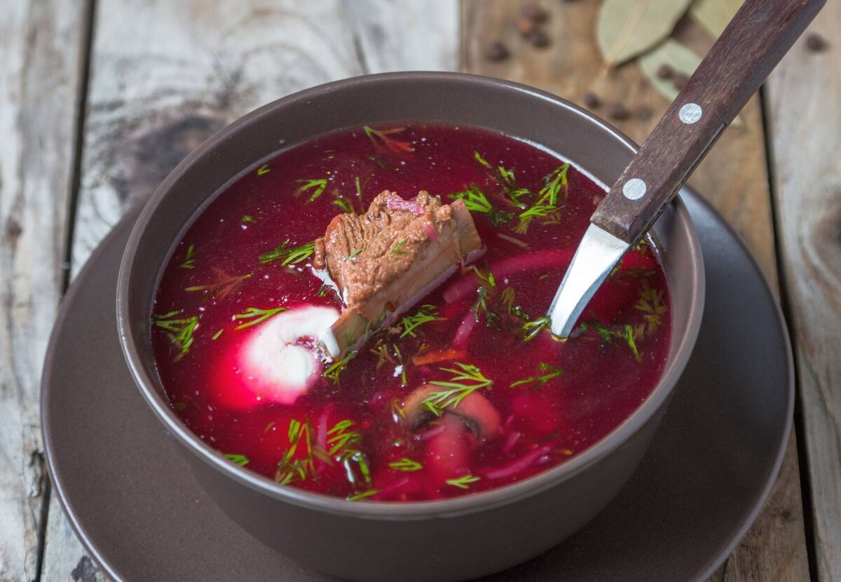 Борщ - это первое блюдо. Готовится на бульоне или воде, но всегда с большим количеством овощей. Итак, морковь очистите и натрите на терке. Лук репчатый нужно нарезать мелко кубиком.