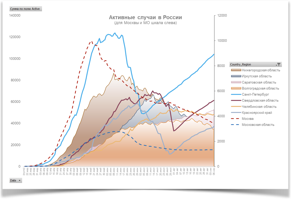 Обзор за неделю с 31 августа по 6 сентября 2020. Россия в целом Активные случаи нарастающим итогом в России за неделю выросли(!) на 485 случаев и составляют 167 тыс. случаев. Рост конечно символический, но рост зафиксирован первый раз с середины июня(!), поэтому признак не очень хороший, но пока незначительный. В «лидерах» по числу активных случаев по состоянию на текущий момент: Также на первом графике можем наблюдать аномальные кривые по активным случаям по Питеру, Свердловской области и Красноярскому краю. Все-таки это манипуляции со статистикой скорей всего по выписке выздоравливающих с целью краткосрочного занижения показателей в июле. Более детально данные за последнюю неделю: Выводы:
