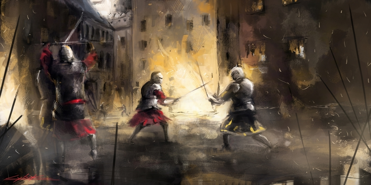 - АААААААААААААА, - крик ужаса, раздираемый строй, всё в крови, и один барбют таки попадает по Жизелю рассекая бармицу и проникая в горло. Дальше только глухое бульканье крови и смерть, смерть того, кто её не заслужил, и капли, много капель крови стекающих на котту такого же, страшного цвета красной смерти.