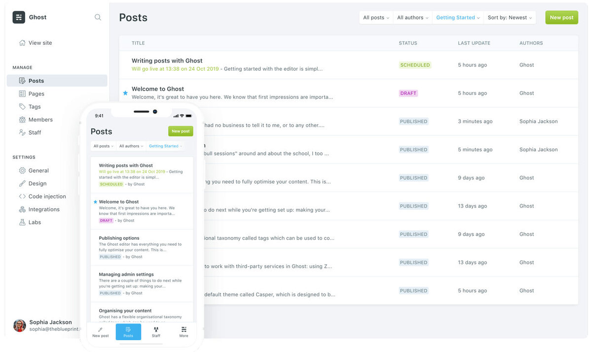 Интерфейс и общий подход действительно напоминает Wordpress, та же знакомая система публикации постов из коробки, магазин с кучей платных тем. И хоть Ghost и позиционируется как Headless, штатно предлагает средства шаблонизации на базе handlebars. Впрочем, штатно имеются связки с Vue (Nuxt), React (Next) и др.