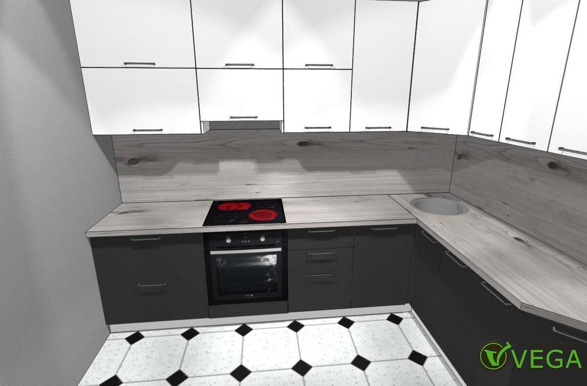 Г-образный гарнитур несколько сложнее и дороже проектировать. Как правило, в углу располагается мойка, рядом с которой может быть посудомоечная или стиральная машина. По смежной стене не рекомендуется устанавливать ящики и сетки, т. к. размера угловой планки недостаточно для выдвижения направляющих. Угловая кухня может быть в прямоугольных, небольших и средних помещениях.