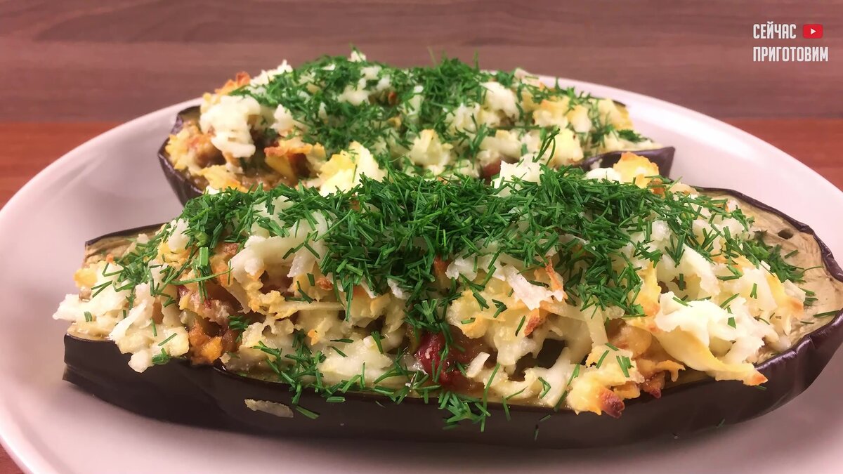 Готовые баклажаны с фаршем посыпаем свежем укропом. Баклажаны, запеченные с фаршем и овощами, можно подавать.