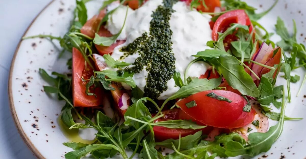 Вяленые томаты нарезают на тонкие полоски. Авокадо очищают, удаляют сердцевину, мякоть нарезают на тонкие ломтики. Приготовленные перцы очищают изнутри и нарезают соломкой. Начинают выкладывать ингредиенты на тарелку. В первую очередь выкладывают промытые листья салата и рукколы. Затем выкладывают перцы и ложкой равномерно выкладывают страчателлу. Добавляют авокадо и томаты. Готовый салат сверху посыпают орешками, посыпают на свой вкус солью и перцем. Поливают маслом и бальзамическим соусом. Приятного аппетита!