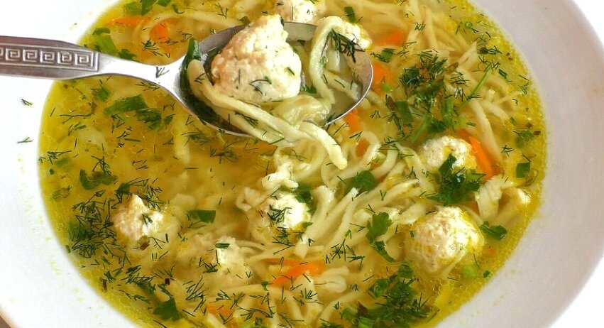 Необходимые продукты: Для бульона: - 1/2 курицы. - 2 л воды. - Соль, перец. - Лавровый лист. - Зелень укропа. Для зажарки: -1 луковица. -1 морковь. Для лапши: - 1 стакан муки - 2 яйца. - 0,25 стакан воды. - Соль по вкусу Способ приготовления: Приготовление лапши: муку высыпать в тарелку, сделать в середине углубление, разбить в него яйца, влить воду и посолить. Взбить тесто миксером и выложить его на разделочную доску, посыпанную мукой. Далее месить тесто руками, подсыпая в него по немного муку, до густоты, чтобы тесто не прилипало к рукам. Затем раскатать тесто до толщины блинчика и оставить на 5 минут подсохнуть. Потом скатать тесто в рулет и порезать на тоненькую лапшу. Отварить курицу, вынуть из бульона, остудить и порезать на маленькие кусочки. Добавить в бульон макароны и варить 15-20 минут. Затем пережарить лук и морковь, добавить в бульон. Перед подачей добавить в каждую порцию курицу и зелень укропа. Приятного аппетита!