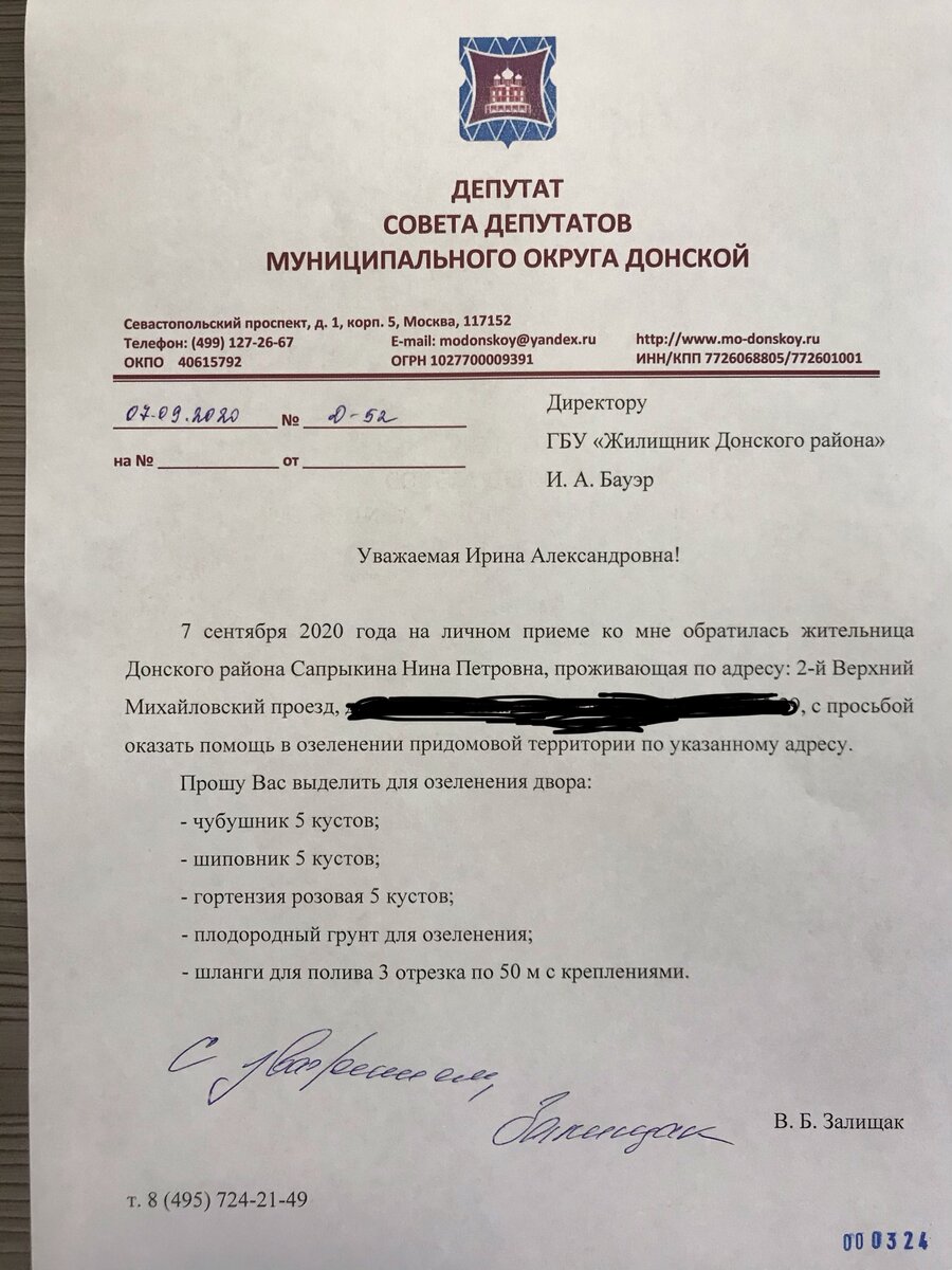 7 сентября 2020 г. на личном приеме ко мне обратилась жительница Донского района Сапрыкина Н. П. с просьбой оказать помощь в озеленении придомовой территории. Десять лет Нина Петровна ухаживает за своим двором, теперь это один из самых красивых дворов в районе. Со всей округи жители приходят посмотреть на образцовый порядок и красоту зеленых насаждений. Подготовил письмо в ГБУ «Жилищник Донской» с просьбой выделить все необходимое для озеленения: плодородный грунт, шланги для полива и кустарники для посадки. Возьму просьбу жительницы под личный контроль. Следующий прием жителей состоится в понедельник (14 сентября) с 16:00 до 18:00 по адресу: г. Москва, Севастопольский проспект, д. 1, корп. 5 в помещении аппарата Совета депутатов Муниципального округа Донской. Предварительная запись по телефону: 8 (499) 127-26-67 https://youtu.be/iUVbQQRG0Co