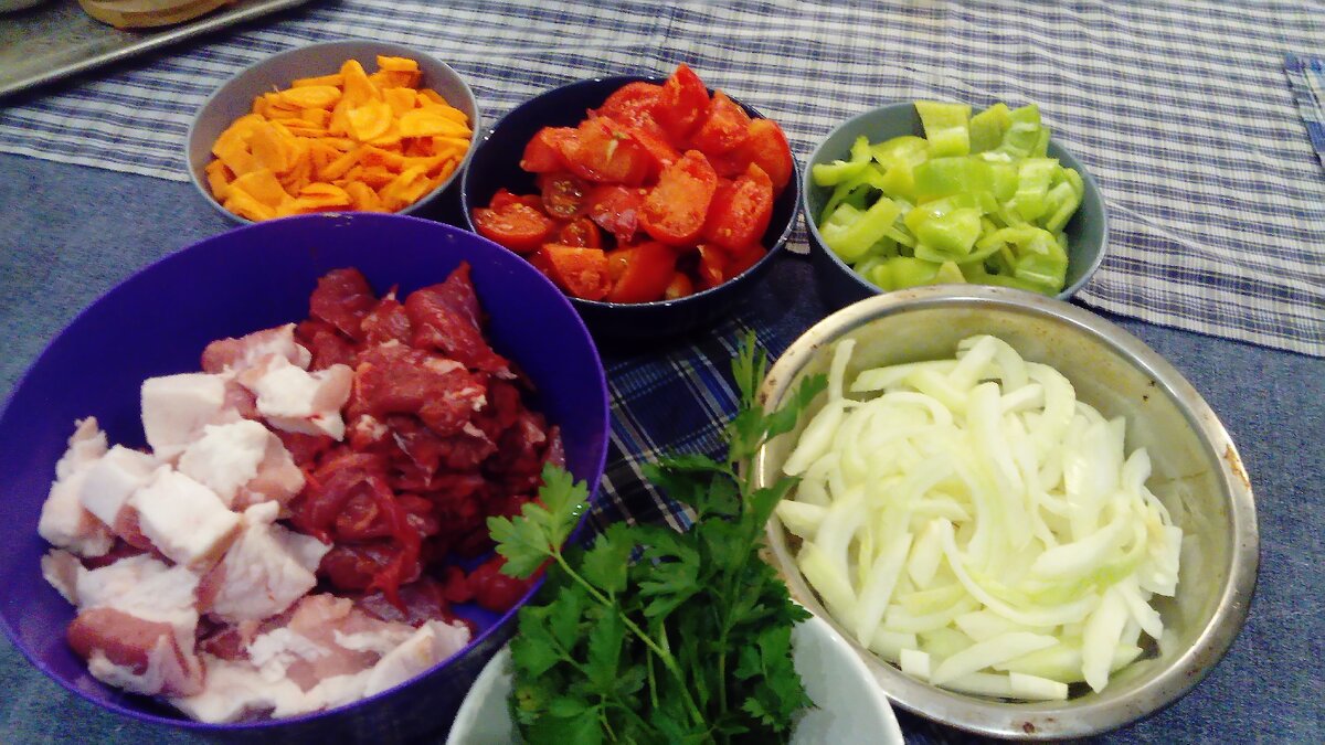 Достаточно мелко режем мякоть говядины. Я, кроме говядины, подготовиоа еще и грамм 200 свинины. Но классика жанра- все же чисто говядина или баранина. Чистим овощи, и крупно, полукольцами режем лук. Морковь режем кружочками. Помидоры и перец режем как хотим, главное - не мельчить.