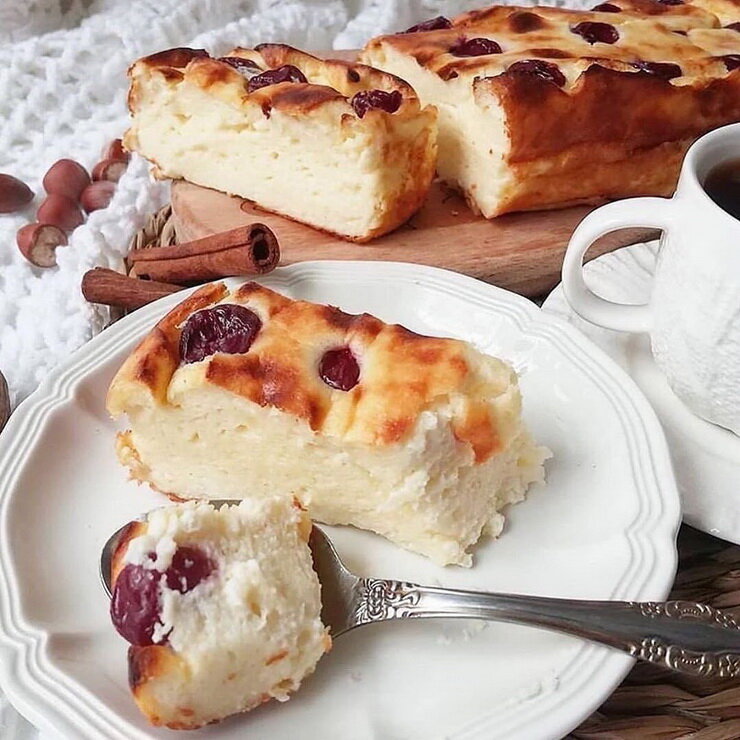Творог-300гр Кефир 2,5%-150гр Яйца-2шт Манная крупа-3 ст.л. Ванильный сахар-1ч.л. Сливочное масло-30гр растопленное Подсластитель любой по вкусу и желанию. Вишня-можно любые ягоды использовать, замороженные и свежие.