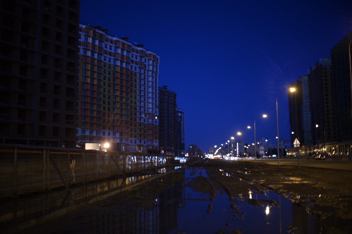 Приехали мы этим летом погостить в новый район Комендантского проспекта к нашему другу. Ни разу я до этого там не была. А подруга говорила мне, что уж очень нравится ей этот район. Почему-то из-за этого я думала, что там хорошие новостройки, приятные дома, интересные общественные зоны... Опять же, другая давняя подруга там живёт уже очень давно со всей семьей, и им нравится. В общем, говорили мне, что жить там хорошо и не удрученно и что это ну уж точно не девяткино, а намного лучше. Но оказалось всё не так. Совсем. Приехали мы туда уже ночью... Удобно было с севера на север добираться, естественно, не на метро, поэтому поехали мы на троллейбусе. Про общественный транспорт в Санкт-Петербурге я уже готовлю отдельную статью, в которой будет много боли. И вот, выйдя из транспорта, нам нужно было пройти ещё около 2 километров пешком. Это дело мы безумно любим и всегда при возможности предпочтём пешую прогулку, нежели какую-нибудь маршрутку. Идти было сложно. Половина зданий ещё строится и
