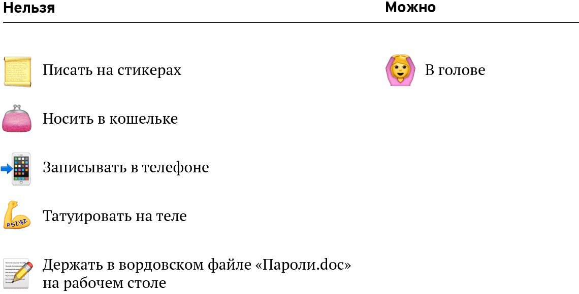У каждого человека собственная техника запоминания пароля. Если у вас нет, попробуйте такую: 1. Возьмите простую фразу, которую вы точно запомните. Например, «картошка с грибами». Напишите ее: kartoshka s gribami. 2. Представьте, что произносите эту фразу с акцентом. Как бы вы ее тогда написали? Например, с итальянским акцентом: kartOshka s gribammi. 3. Замените пробелы на какой-нибудь знак: тире, точку, запятую или похуже что-нибудь: kartOshka.s.gribammi. 4. Замените какие-нибудь буквы на цифры — но так, чтобы запомнить, что вы меняли. Например, a на @, i на 1: k@rtOshk@.s.gr1b@mm1. Лучше всего пароль запоминается тогда, когда вы его часто вводите. Если вы только сочинили пароль, отключите в почте или соцсетях галочку «запомнить меня», и вам придется вводить его каждый день. Так ваши руки научатся вводить его автоматически. Через неделю можно снова включать «Запомнить меня». Сильный пароль: альтернативный метод Пару месяцев назад я уже рассказывал о методе, чтобы придумать надежный па