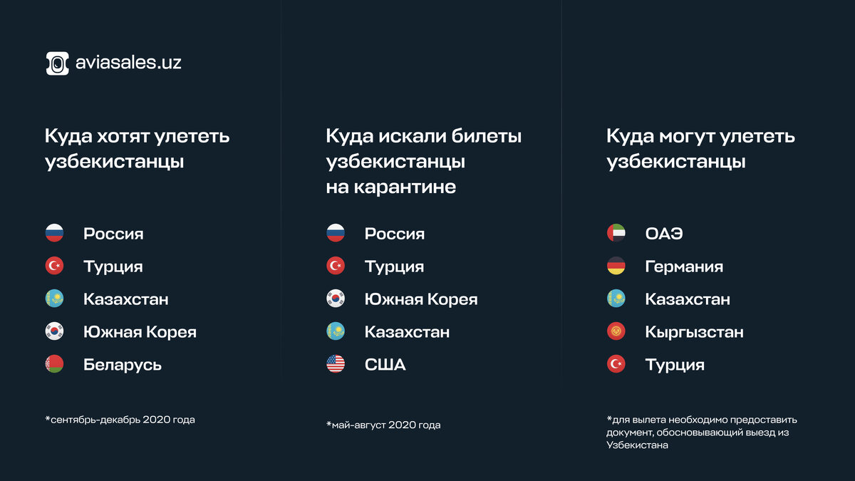 Общая доля поисков в Россию составляет более 60%, но улететь в эту страну узбекистанцы пока не могут. Важно, что даже для вылета в страны, с которыми восстановлено авиасообщение узбекистанцам все еще нужны основания. Необходимо предоставить вид на жительство страны прибытия, приглашение из медицинского учреждения или документ, подтверждающий транзитный рейс. Напомним, что накануне Министерство иностранных дел Узбекистана опубликовало основные