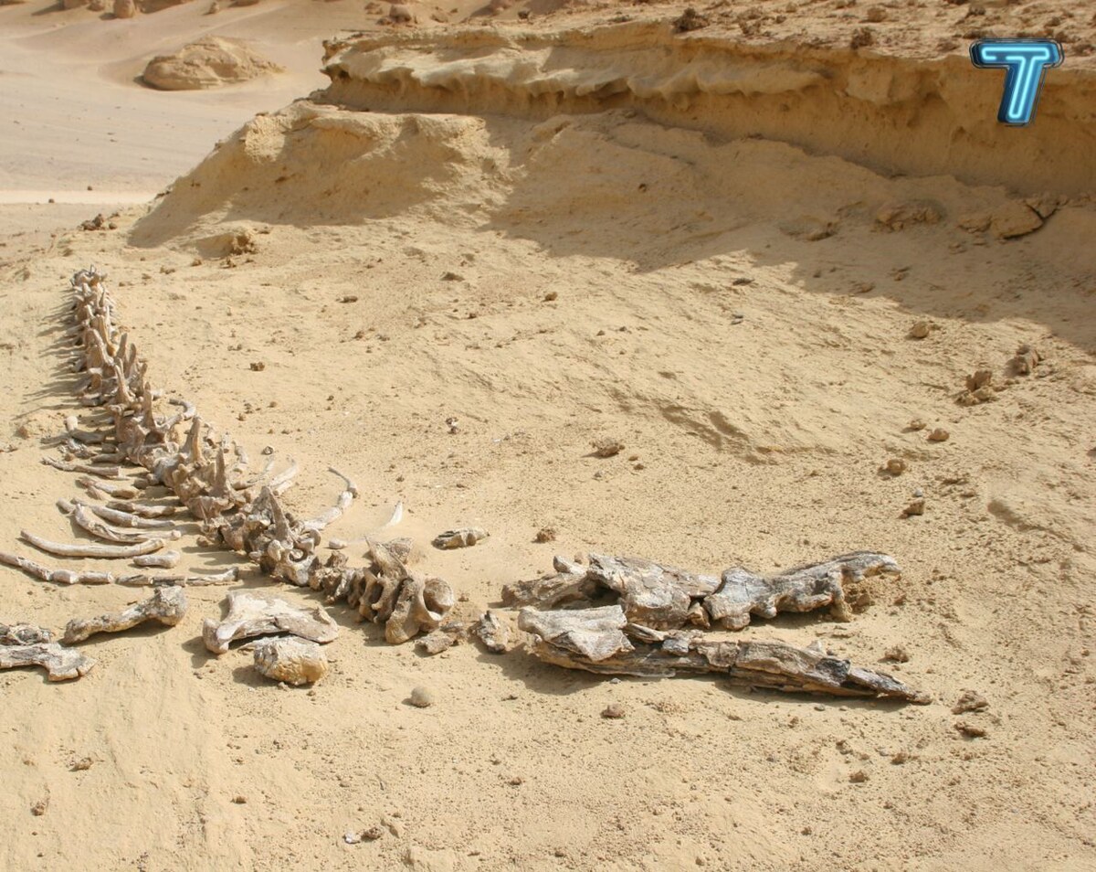 Ого! Это скелет базилозавра, предка кита, которому 35 миллионов лет. Его нашли в Вади-аль-Хитане. Интересно тут то, что это место переводится буквально как Долина китов. Этот гигант не был раскопан. Люди нашли его именно так, он просто лежал на земле. В течение миллионов лет этот скелет благодаря ветру и воде медленно поднимался с земли. Такие находки в который раз показывают нам, что предки китов вполне могли жить на суше.
